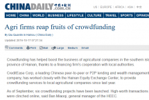 10月17日,國(guó)家英文日?qǐng)?bào)《ChinaDaily》刊發(fā)文章《Agrifirmsreapfruitsofcrowdfunding》,對(duì)海南股權(quán)交易中心“眾籌海南”項(xiàng)目進(jìn)行了深入的報(bào)道。文章分析,“Crowdfundinghashelpedboostthebusinessofagriculturalco...