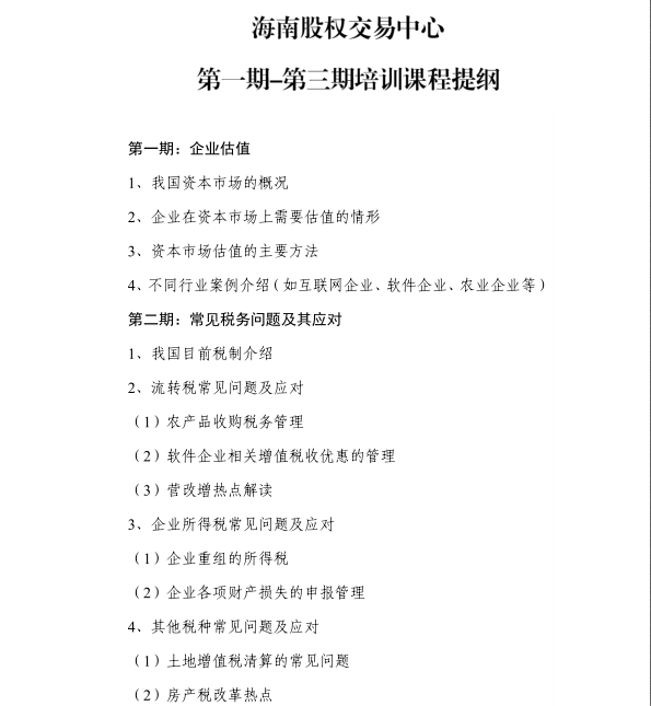 為幫助掛牌企業(yè)解決資金、稅收、以及管理上存在的諸多問題,提升企業(yè)的專業(yè)水平和管理水平,實現(xiàn)全方位成長壯大,海南股權(quán)交易中心(以下簡稱“股交中心”)掛牌企業(yè)培訓班正式開班。首期培訓班,股交中心特邀請中審亞太會計師事務(wù)所(特殊普通合伙)專家提供法律、財務(wù)和管理等方面的免費培訓服務(wù),通知如下: