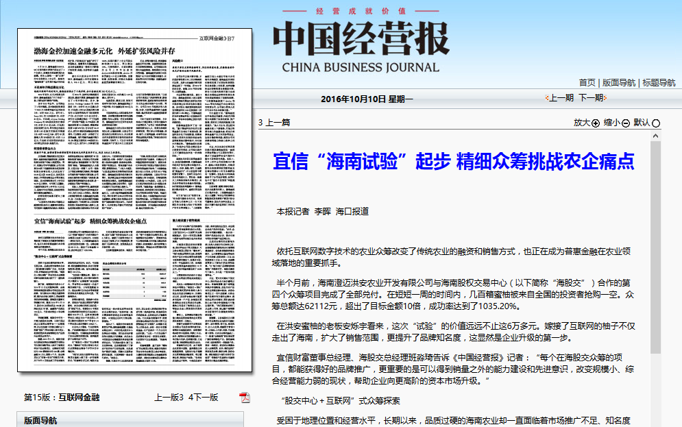 近日,國內(nèi)最早發(fā)行經(jīng)濟(jì)類的報(bào)刊之一《中國經(jīng)營報(bào)》在其互聯(lián)網(wǎng)金融版上報(bào)道“眾籌海南”,文章以《宜信“海南試驗(yàn)”起步 精細(xì)眾籌挑戰(zhàn)農(nóng)企痛點(diǎn)》為題,表示依托互聯(lián)網(wǎng)數(shù)字技術(shù)的農(nóng)業(yè)眾籌改變了傳統(tǒng)農(nóng)業(yè)的融資和銷售方式,也正在成為普惠金融在農(nóng)業(yè)領(lǐng)域落地的重要抓手。