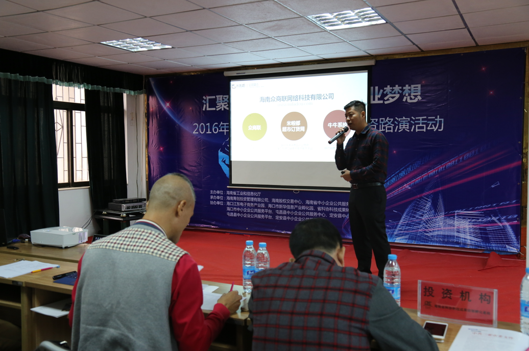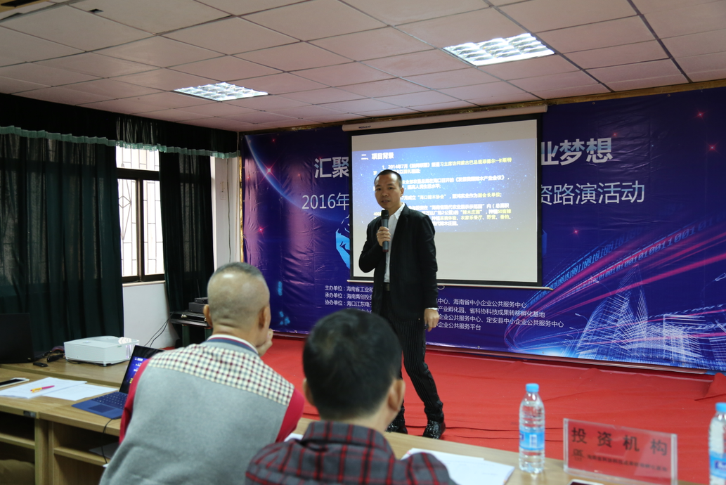 11月24日,“匯聚投資力量,助燃創(chuàng)業(yè)夢想——2016年海南省創(chuàng)業(yè)創(chuàng)新項目投資路演”在海南省科技活動中心順利舉行,同時這也是海南股權(quán)交易中心第16期企業(yè)路演。活動由海南省工業(yè)和信息化廳主辦,海南股權(quán)交易中心、海南青創(chuàng)投資管理有限公司、海南省中小企業(yè)服務(wù)中心聯(lián)合承辦,??诮瓥|電子商務(wù)產(chǎn)業(yè)園等多家單位協(xié)辦。9家路演企業(yè)、團(tuán)隊及6家投資機(jī)構(gòu)參加此次路演活動。