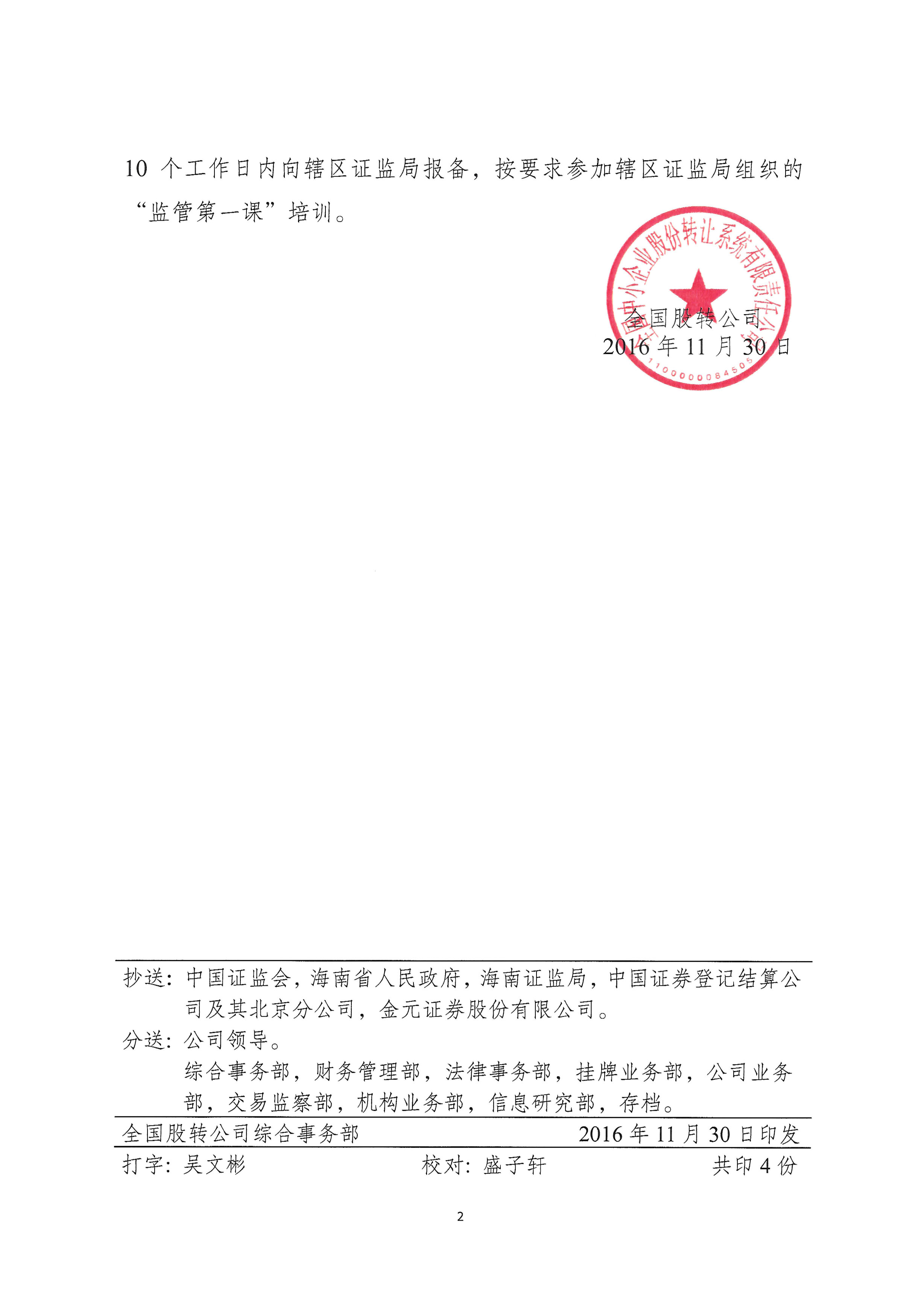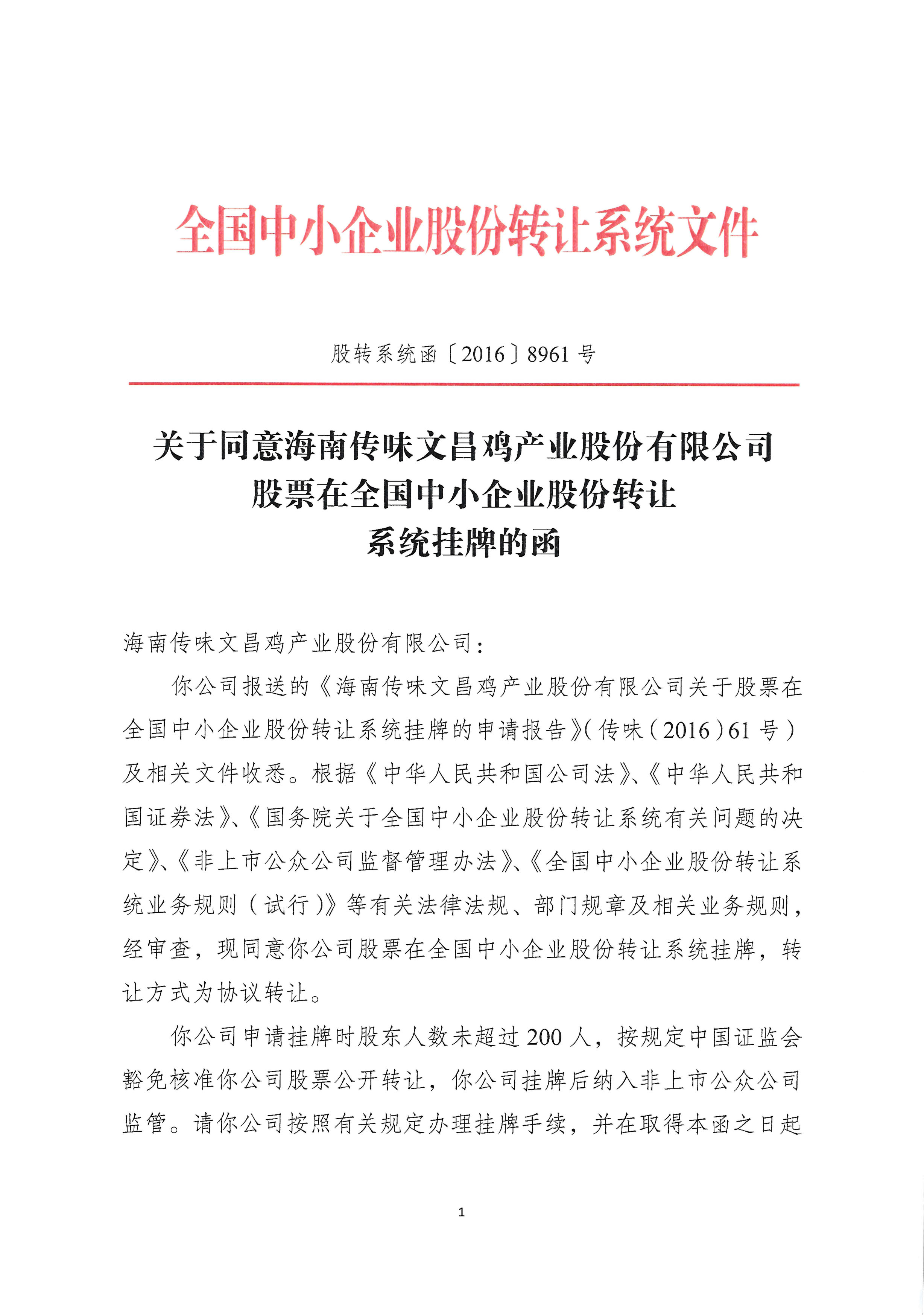 附:《關(guān)于同意海南傳味文昌雞產(chǎn)業(yè)股份有限公司股票在全國中小企業(yè)股份轉(zhuǎn)讓系統(tǒng)掛牌的函》