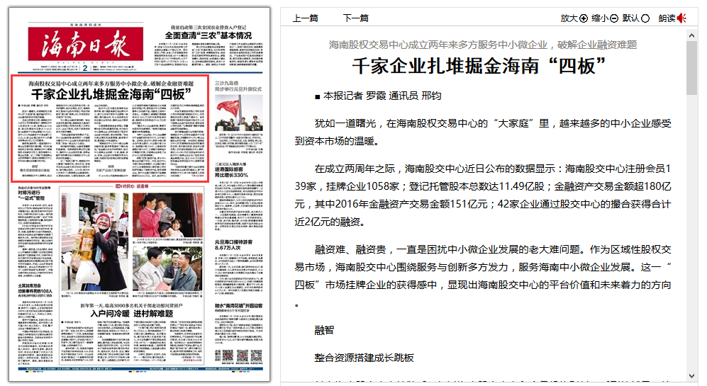 1月2日,海南日報頭版頭條刊發(fā)海南股權(quán)交易中心成立兩周年文章,關(guān)注股交中心成立兩周年。