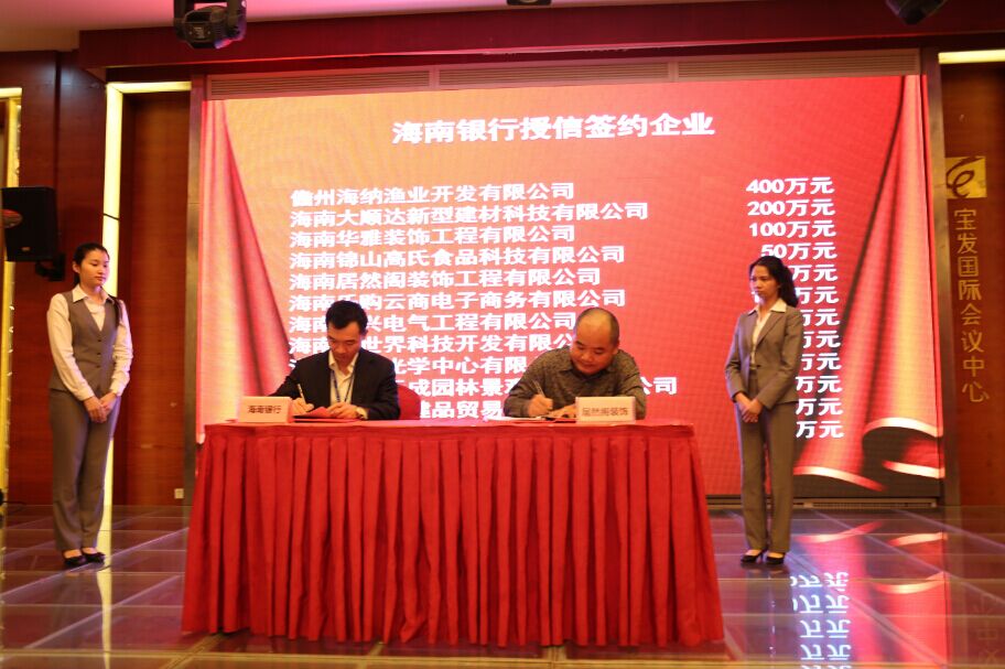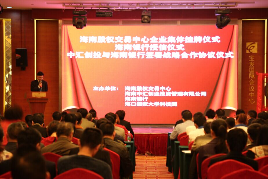 1月15日,海南股權(quán)交易中心企業(yè)集體掛牌暨銀行授信簽約儀式,在??趯毎l(fā)幸福酒店舉行。本次活動(dòng)由海南股權(quán)交易中心、海南中匯創(chuàng)業(yè)投資管理有限公司、海南銀行、??趪?guó)家大學(xué)科技園聯(lián)合主辦。37家企業(yè)現(xiàn)場(chǎng)集體掛牌海南股權(quán)交易中心,其中12家企業(yè)獲得海南銀行合計(jì)額度2100萬(wàn)元的授信。