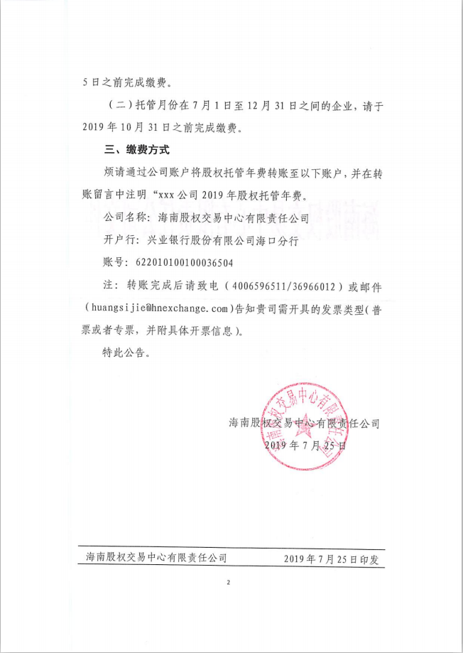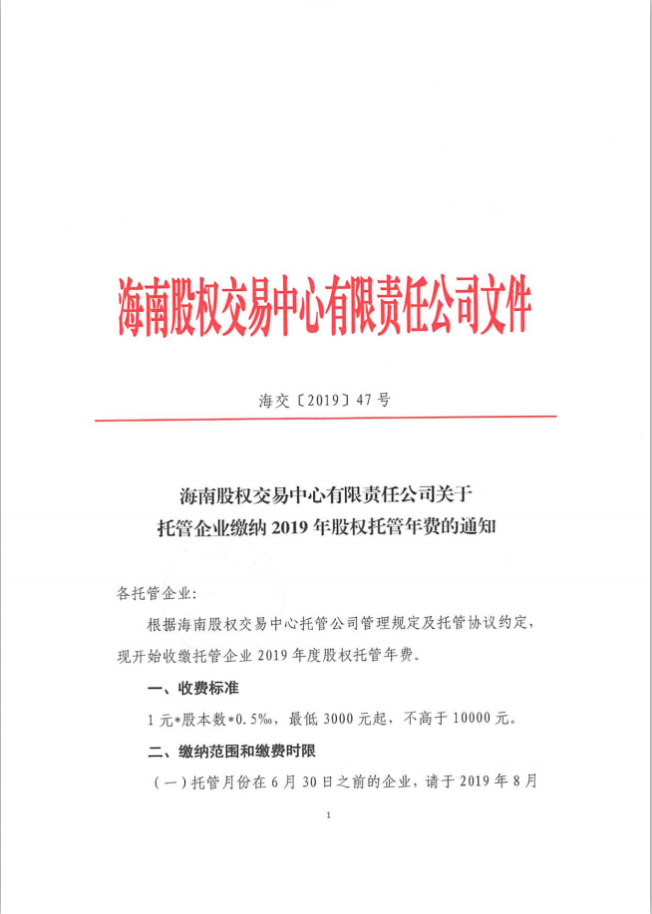 海南股權(quán)交易中心有限責任公司關(guān)于托管企業(yè)繳納2019年股權(quán)托管年費的通知