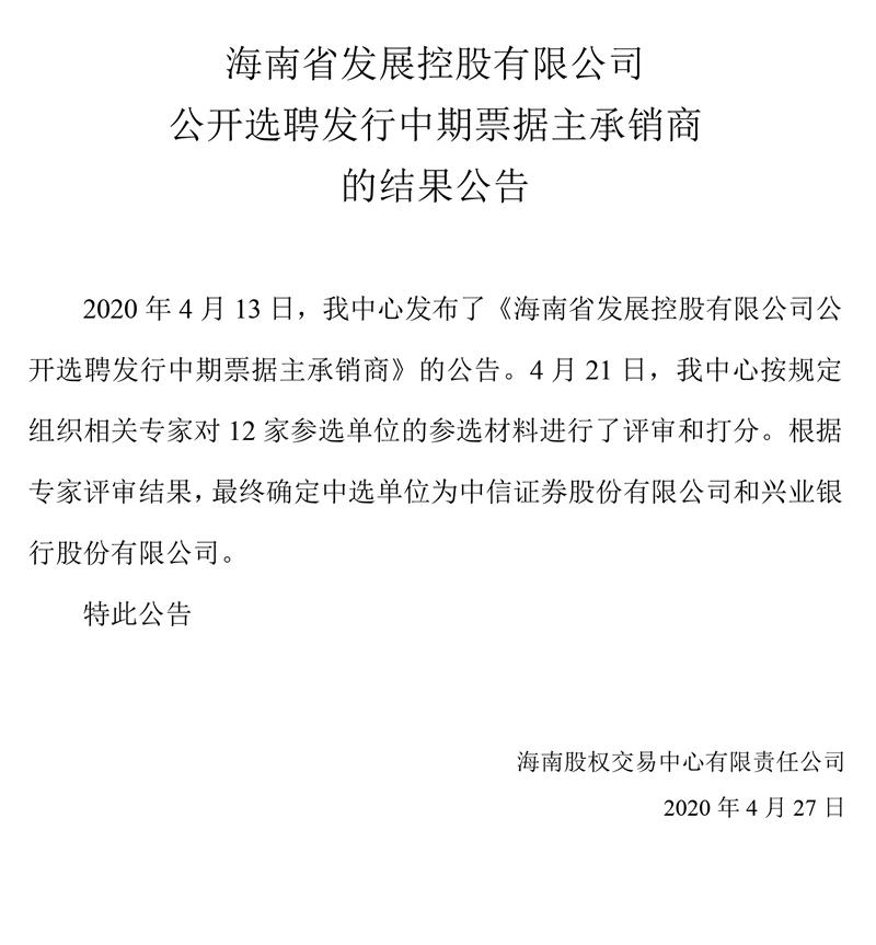 海南省發(fā)展控股有限公司公開選聘發(fā)行中期票據(jù)主承銷商的結(jié)果公告