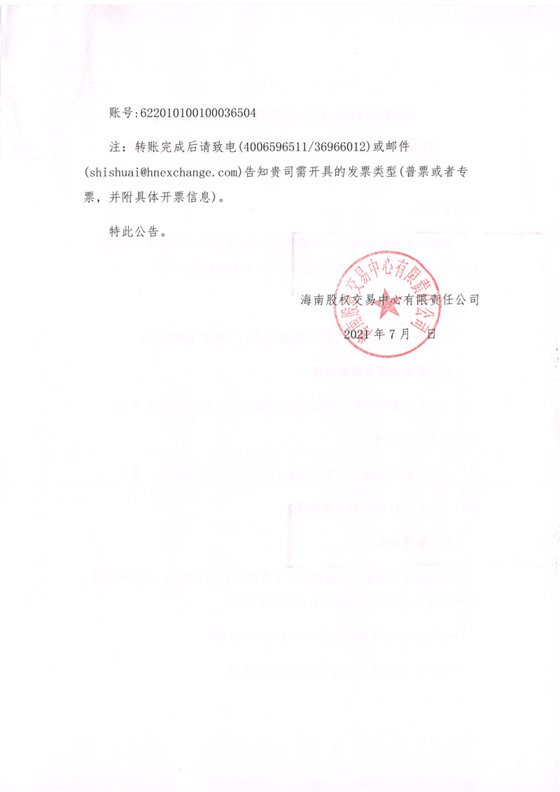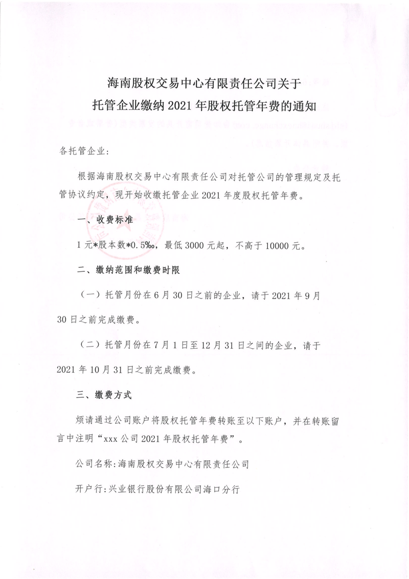 海南股權(quán)交易中心有限責(zé)任公司關(guān)于托管企業(yè)繳納2021年股權(quán)托管年費(fèi)的通知