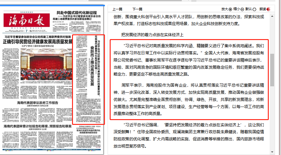 “習(xí)近平總書記對(duì)高質(zhì)量發(fā)展的科學(xué)內(nèi)涵、精髓要義進(jìn)行了集中系統(tǒng)地闡述。我們將認(rèn)真學(xué)習(xí)并在日常工作中以實(shí)際行動(dòng)貫徹落實(shí)?!?/span>全國(guó)人大代表,海南省發(fā)展控股有限公司黨委書記、董事長(zhǎng)周軍平在逐字逐句學(xué)習(xí)習(xí)近平總書記的重要講話精神后表示,當(dāng)前,面對(duì)風(fēng)高浪急的國(guó)際環(huán)境和艱巨繁重的國(guó)內(nèi)改革發(fā)展穩(wěn)定任務(wù),我們更要保持戰(zhàn)略定力,更要堅(jiān)定不移地走高質(zhì)量發(fā)展之路。