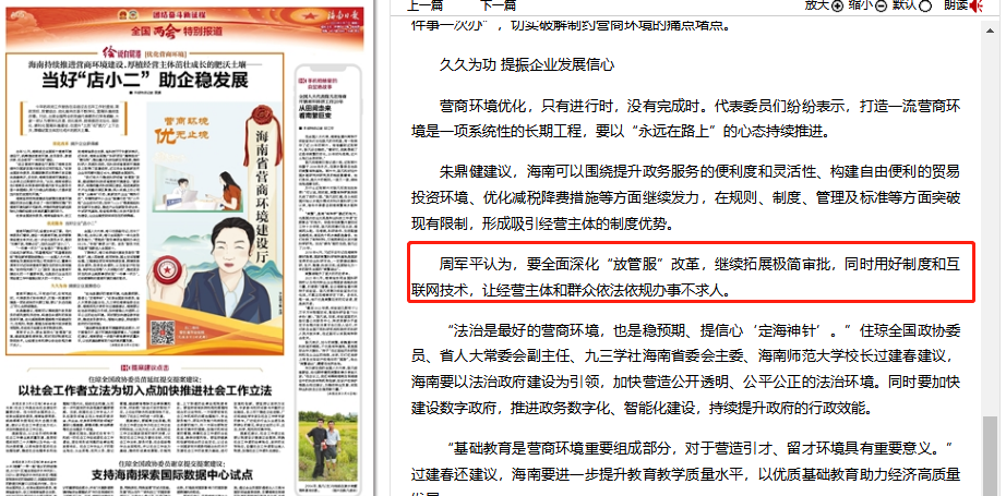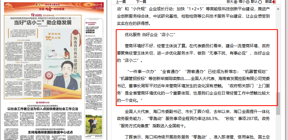 3月7日,海南日?qǐng)?bào)發(fā)布文章《當(dāng)好“店小二”助企穩(wěn)發(fā)展—— 海南持續(xù)推進(jìn)營(yíng)商環(huán)境建設(shè),厚植經(jīng)營(yíng)主體茁壯成長(zhǎng)的肥沃土壤》。文章指出:今年的政府工作報(bào)告在總結(jié)過去五年工作時(shí)提到,簡(jiǎn)政放權(quán)、放管結(jié)合、優(yōu)化服務(wù)改革不斷深化,營(yíng)商環(huán)境明顯改善。對(duì)此,出席全國(guó)兩會(huì)的我省代表委員們深有感觸。