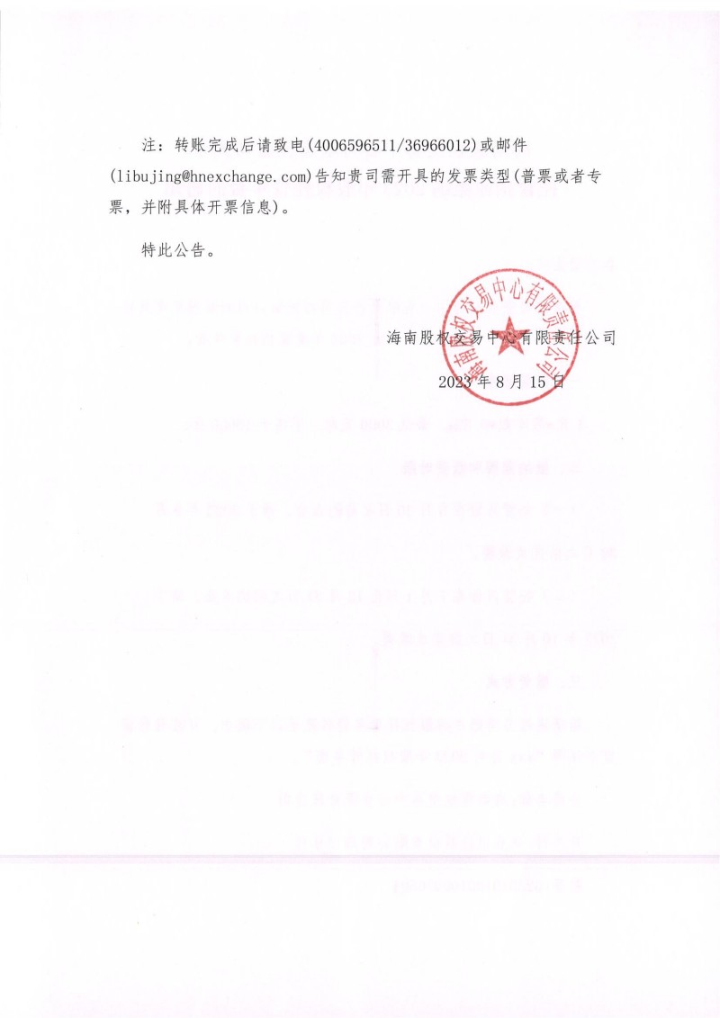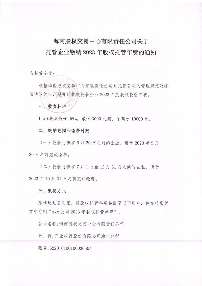 海南股權(quán)交易中心有限責任公司關(guān)于托管企業(yè)繳納2023年股權(quán)托管年費的通知