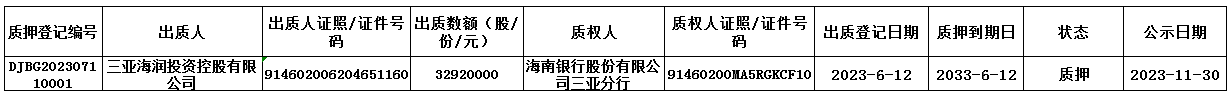 海南海潤珍珠股份有限公司(企業(yè)代碼:993883)股東三亞海潤投資控股有限公司于2023年7月11日在我中心辦理了股權質(zhì)押登記業(yè)務,具體情況如下: