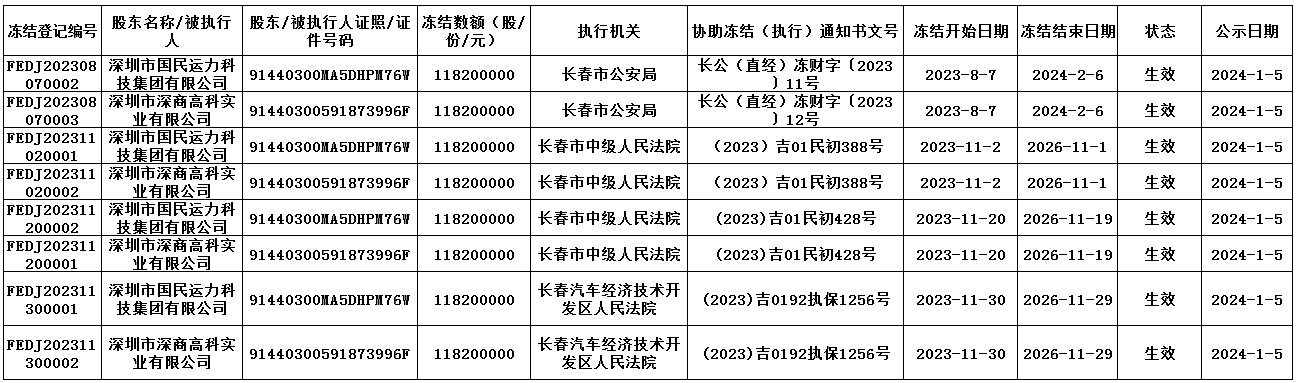 依據(jù)長春市公安局《協(xié)助凍結(jié)財產(chǎn)通知書》[長公(直經(jīng))凍財字〔2023〕11號)]、長春市人民法院《協(xié)助執(zhí)行通知書》[(2023)吉01民初388號]及長春汽車經(jīng)濟(jì)技術(shù)開發(fā)區(qū)人民法院[(2023)吉0192執(zhí)保1256號]等文件,我中心為??诼?lián)合農(nóng)村商業(yè)銀行股份有限公司(企業(yè)代碼:893529)股東深圳市國民運力科技集團(tuán)有限公司、深圳市深商高科實業(yè)有限公司辦理股權(quán)凍結(jié)/股權(quán)輪候凍結(jié)登記,具體情況如下:
