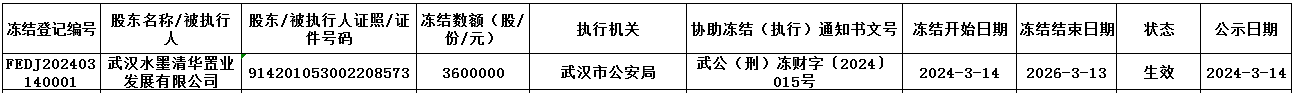 依據(jù)武漢市公安局《協(xié)助凍結(jié)財(cái)產(chǎn)通知書》[武公(刑)凍財(cái)字〔2024〕015號(hào)]文件,我中心為海南屯昌長(zhǎng)江村鎮(zhèn)銀行股份有限公司(企業(yè)代碼:893524)股東武漢水墨清華置業(yè)發(fā)展有限公司辦理股權(quán)凍結(jié)登記,具體情況如下: